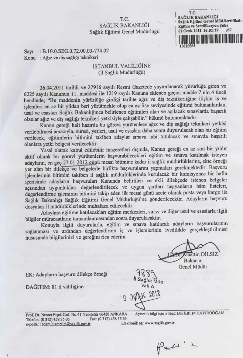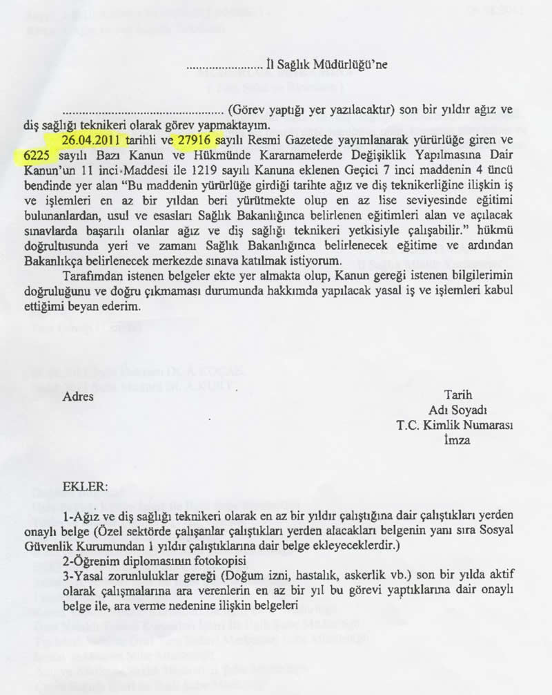 26.04.2011 tarih ve 27916 sayılı Resmi Gazete’de yayınlanarak yürürlüğe giren ve 6225 sayılı Kanunun 11.maddesi ile 1219 sayılı Kanuna eklenen geçici madde 7’nin 4.bendinde; “Bu maddenin yürülüğe girdiği tarihte ağzı ve diş teknikerliğine ilişkin iş ve işlemleri en az bir yıldan beri yürütmekte olup en az lise seviyesinde eğitimi bulunanlardan, usul ve esasları Sağlık Bakanlığı’nca belirlenen eğitimleri alan ve açılacak sınavlarda başarılı olanlar ağız ve diş sağlığı tekniker yetkisiyle çalışabilir.” hükmü bulunmaktadır.